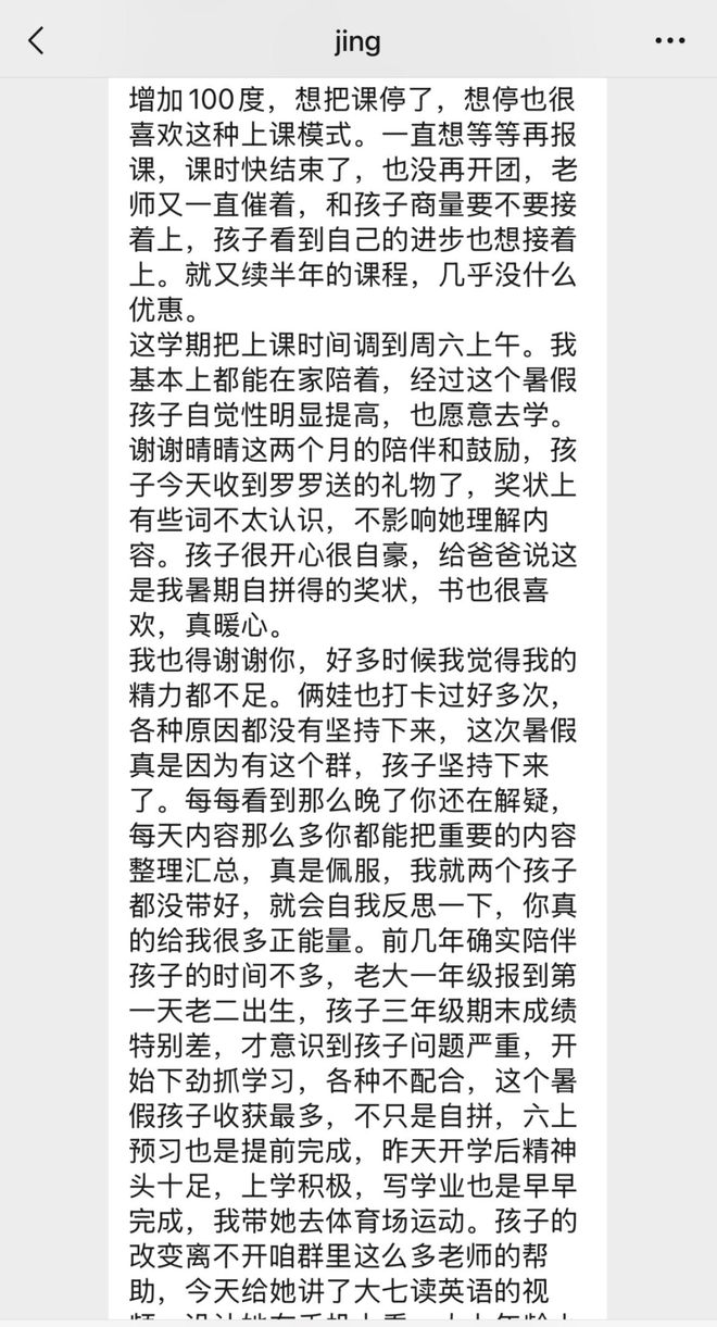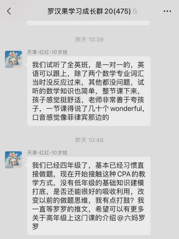 开团之后,因为群里反馈好,所以有不少朋友问什么时候返团,但我们一直没着急返,就是希望看看第一批使用课程的孩子坚持学下来的真实体验以及效果。效果好,咱们就返团,效果不好,可能就是大批量服务的时候执行度不好,那就不返了。