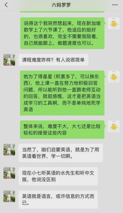 后来,因为新加坡数学有全英课,课程体系也得到了小周老师的认可,罗罗姐就让小七了一段时间,于是我们也有了更多关于这门课程的讨论,虽然小七因为年龄小试课失败了,但我却被用英语学数学的形式种了草,于是罗罗姐就建议大七去试试一年级的全英课。起初我们只是抱着体验的心态,没想到,上了半年之后,我对这个课越来越满意。