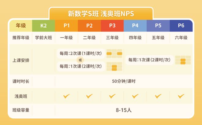 校内基础掌握的很好,明显感觉孩子在班级内保持领先,可以跟授课老师沟通评估孩子能力,并做对应的考测,评估后入班。优先转入NPS(新数学S班),适合大部分想接触浅奥的孩子。