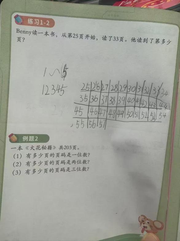前段时间,罗罗姐得知新加坡数学竞赛课的内容全部更新了,便要了新课程的练习册,同时也给大七寄了一份。我看了一年级 2 月份的练习题,发现里面有巧算内容,难度不算大(相对来说,计算题的难度较小)。我给大七看了一道例题,后面的练习题他基本上都会做了。后来我翻看二年级的页码问题时,把大七叫过来一起看。他先是用更小的数自己尝试,比如从第 1 页开始读,读 5 页,读到了第几页,他自己写出来,试图找出规律并运用到题目中。当他还没有理清思路时,就跟我说:“妈妈,我还有一个笨办法。” 接着,他就拿起笔从 25 开始一个一个地写出来。等他写完我才发现,他把这些数十个一行,写了三行,多出来的三个数放在了第四行,而且还画好了表格(先忽略他写的字以及表格画得歪歪扭扭,毕竟我只是随口问问,并不是正式让他做题)。这让我立刻联想到新加坡数学课上老师的教学方法,老师总会用数形结合的方式帮助孩子理解题意,而大七遇到难题时,第一反应也是这么做。我马上把这件事告诉了罗罗姐,她告诉我,小周老师说新加坡数学的教学方式好,就在于非常注重培养孩子数形结合的习惯。低年级的题目比较简单,这种习惯的优势还不明显,不管用什么方法都能做出来。但随着题目难度增加,养成这种好习惯的孩子优势就会慢慢显现出来。看来,大七认为的 “笨办法” 其实并不笨,反而是一种打基础的重要能力。