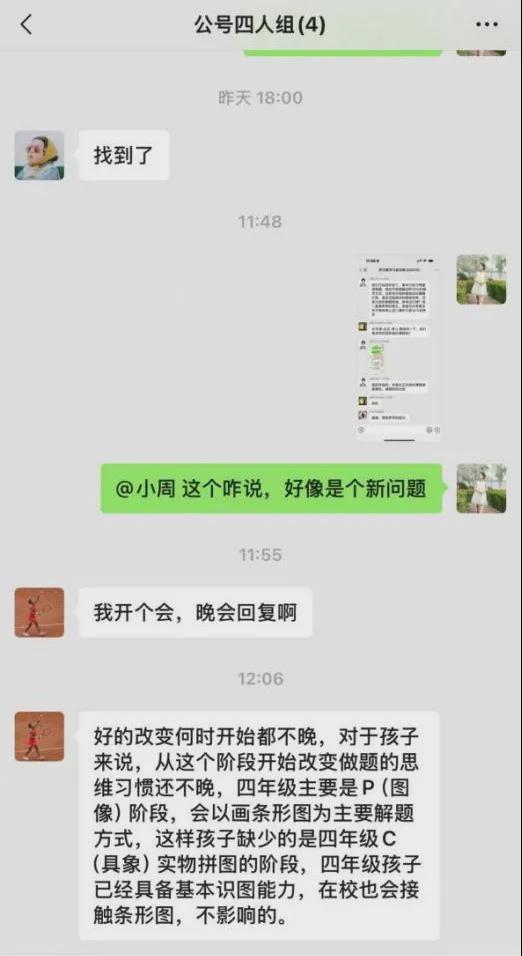 小周老师对此的回复是,好的改变无论何时开始都不算晚。对于四年级的孩子来说,现在开始改变做题思维习惯仍然来得及。四年级在 CPA 教学法中主要处于 P(图像)阶段,会以画条形图作为主要的解题方式。虽然孩子缺少了四年级 C(具象)实物拼图的阶段,但这个年龄段的孩子已经具备了基本的识图能力,并且在学校也会接触到条形图,所以并不会对学习造成太大影响。