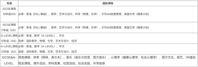 A-Level课程采用三年或四年学制,分为IGCSE(国际普通中学教育证书)和A-Level两个阶段。IGCSE阶段学制通常为两年,成绩优异者可压缩至一年完成,期间学生需学习英语、数学及中文三门必修,并从超过70门可选科目中选修五门。进入A-Level阶段后,学生需攻读三至四门学科,课程涵盖进阶数学、物理、化学、生物、经济、会计、计算机等。A-Level考试成绩采用等级制评定(A*–E及U),每年设有三个考季,学生可多次报考,最优成绩可用于申请英国、美国、加拿大、澳大利亚、中国香港等全球多数国家和地区的本科院校。