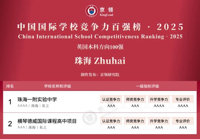 在京领2025中国国际学校竞争力百强榜·英国本科方向中,珠海一附实验中学和横琴德威国际课程高中项目上榜,分别获得4A和3A综合评级。