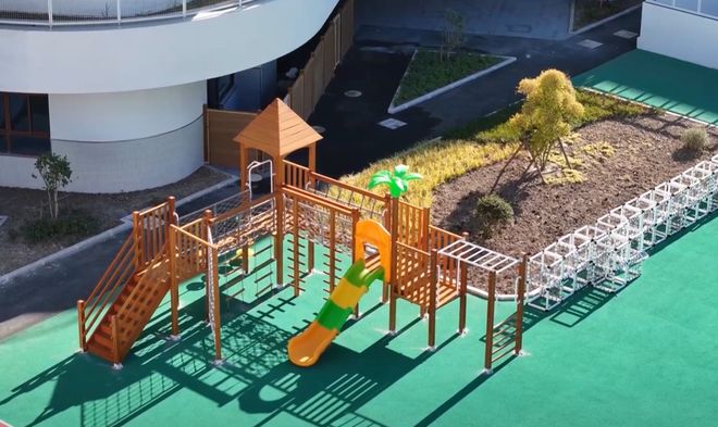 与中学一墙之隔的金馨幼儿园同样引人注目。纯白色流动曲线外墙与专业化的园区设计相得益彰。幼儿园采用“九宫格”布局,班级教室分布在外围,确保每个班级都能“开门见绿”,中央区域则集中设置了各类功能教室。