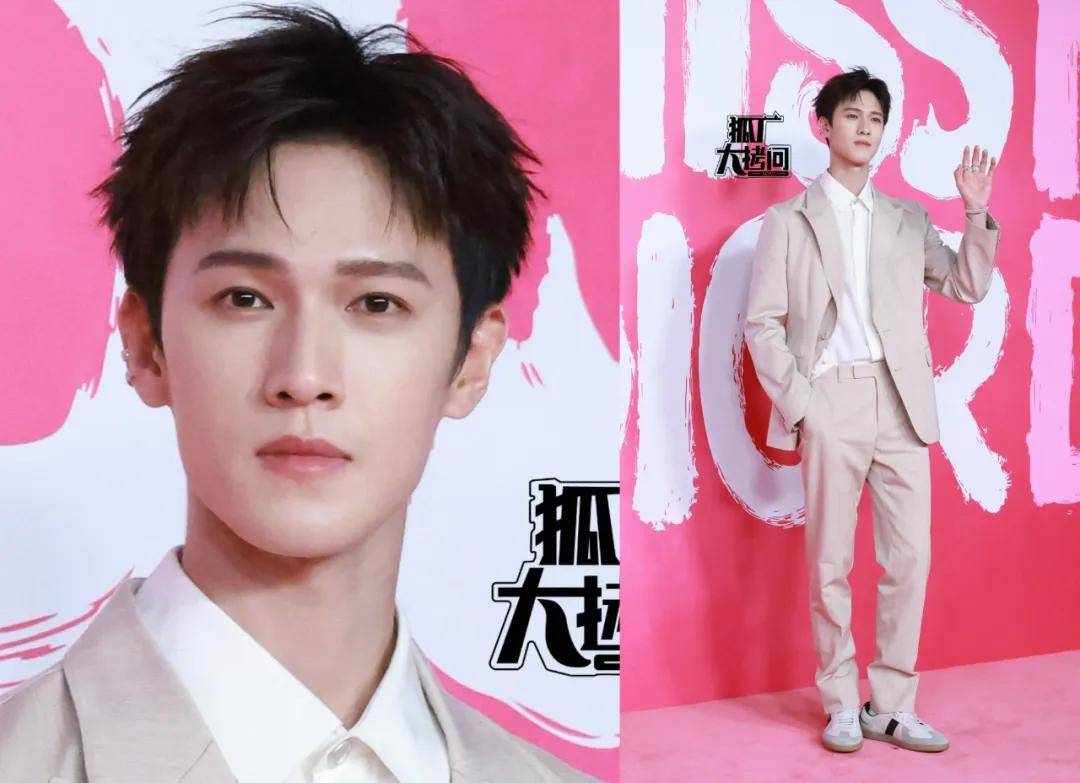 李昀锐穿了一套米色西服套装配运动鞋,精致之余又多了一份休闲。感觉近几年上位的男明星都是这种脸型偏窄长的、长相比较秀气的类型。